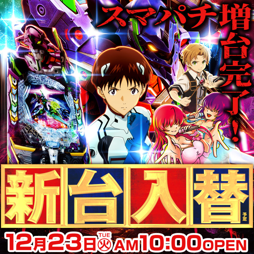 お待たせしました!今回の新台入替はこちら! エヴァ最新作!!!! 人気コンテンツも続々!お楽しみに!